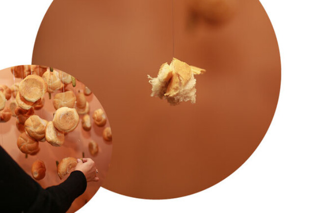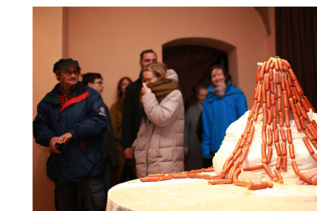 Constantly being judged by others merely because of one’s own body causes an imposed feeling of guilt. That is why an insecure person often hides like a criminal when eating. Merklein addresses eating as a criminal act in her piece Im Keller (In the basement) and formally draws upon Cindy Sherman’s series of photographs Untitled Film Stills. Merklein’s large-format photography shows the same narration and reaction to something outside the picture. This reflects the look, the body movement, the basement light and the theatrical characterization of those presented, with a stronger focus on the characterization than on the plot itself. The viewer may assume a certain unmasking of women (in the American murder mysteries of the 1940s), liberation and emancipation from social constraints and valid norms. In film noir style, two vicious anti-heroes appear. They cynically eat up all the salad and drink all the water.