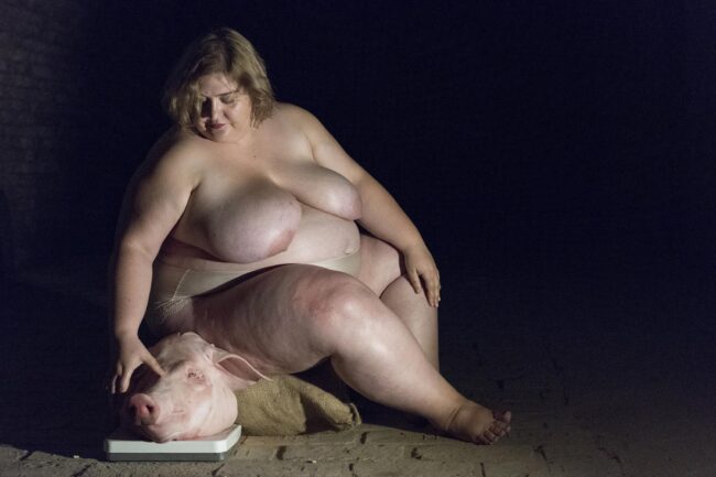From the wreckage, Merklein reveals a real pig’s head. Sitting beside it, she caresses it gently—a haunting, intimate gesture of recognition. The performance ends here: weight destroyed, judgment suspended, tenderness reclaimed.